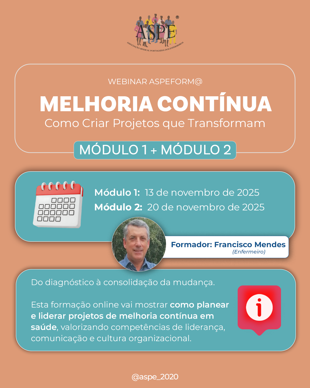 Em dois módulos práticos e dinâmicos, os enfermeiros vão aprender a planear, implementar e avaliar projetos transformadores, aplicando metodologias de melhoria contínua e valorizando o seu percurso profissional.