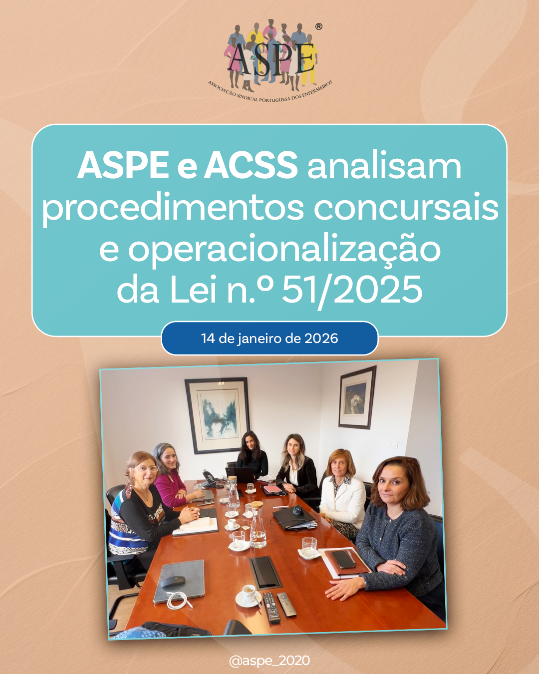 A ASPE foi recebida esta quarta-feira, dia 14 de janeiro, na Administração Central do Sistema de Saúde, IP (ACSS), na sequência de um pedido de reunião para discutir as irregularidades recorrentes nos procedimentos concursais para a contratação de enfermeiros, a avaliação do desempenho pelo SIADAP e a aplicação da Lei n.º 51/2025, relativa à eliminação das posições remuneratórias virtuais.