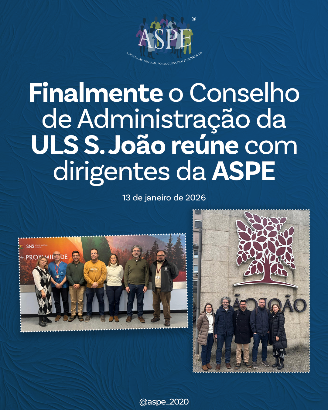 A Associação Sindical Portuguesa dos Enfermeiros (ASPE) reuniu no dia 12 de janeiro de 2026, com o Conselho de Administração (CA) da Unidade Local de Saúde de São João, numa reunião presencial realizada nas instalações do Serviço de Gestão de Recursos Humanos da unidade, com a duração aproximada de duas horas e meia.