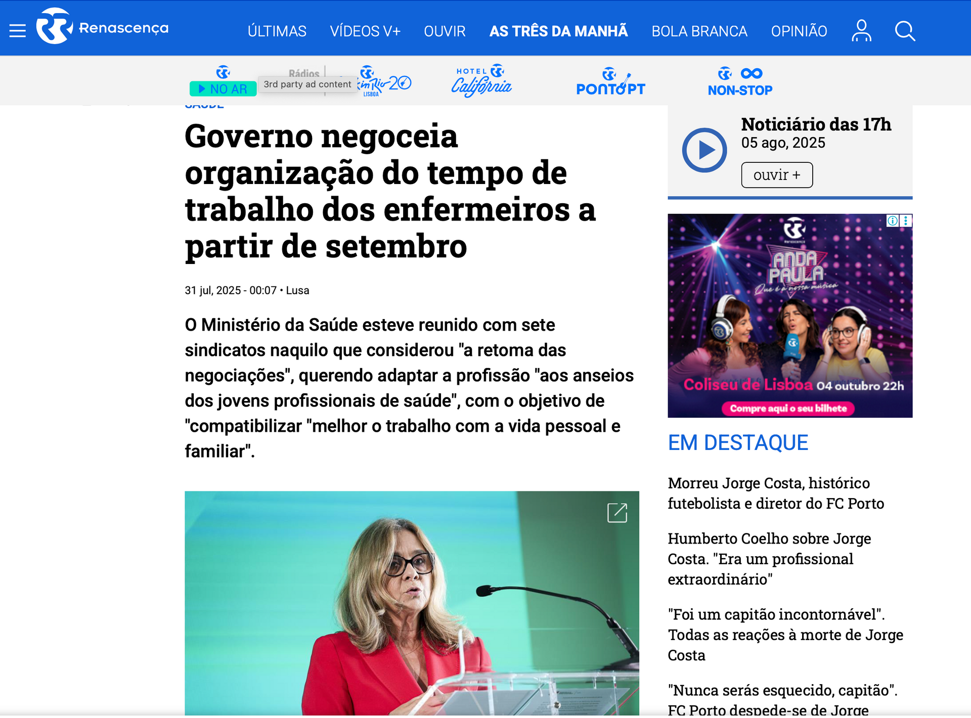 Antena Minho Online- Governo começa a negociar organização do tempo de trabalho dos enfermeiros | 03-09-2025